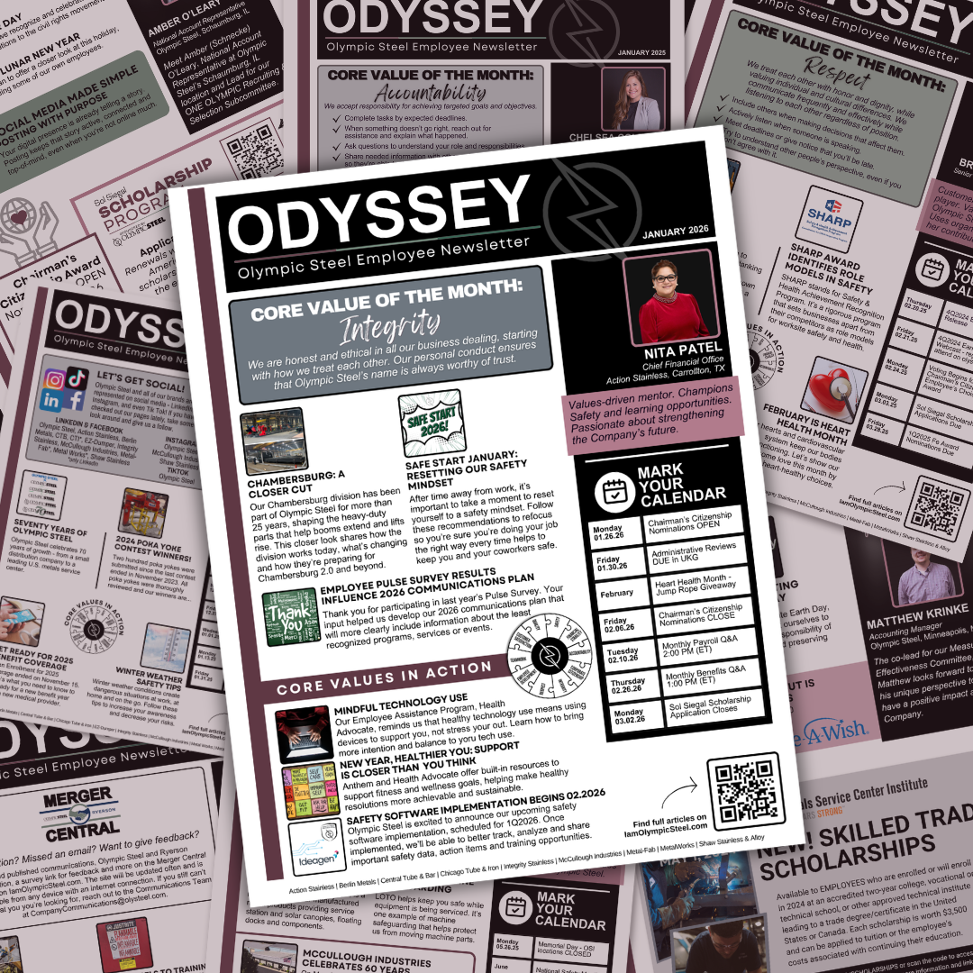 Each month, we'll share feature articles in the following categories: Industry and Our Business, Safety, Benefits, our Core Values in Action and our newest feature, Social Media Made Simple. Plus, a One Olympic Team Member Spotlight!