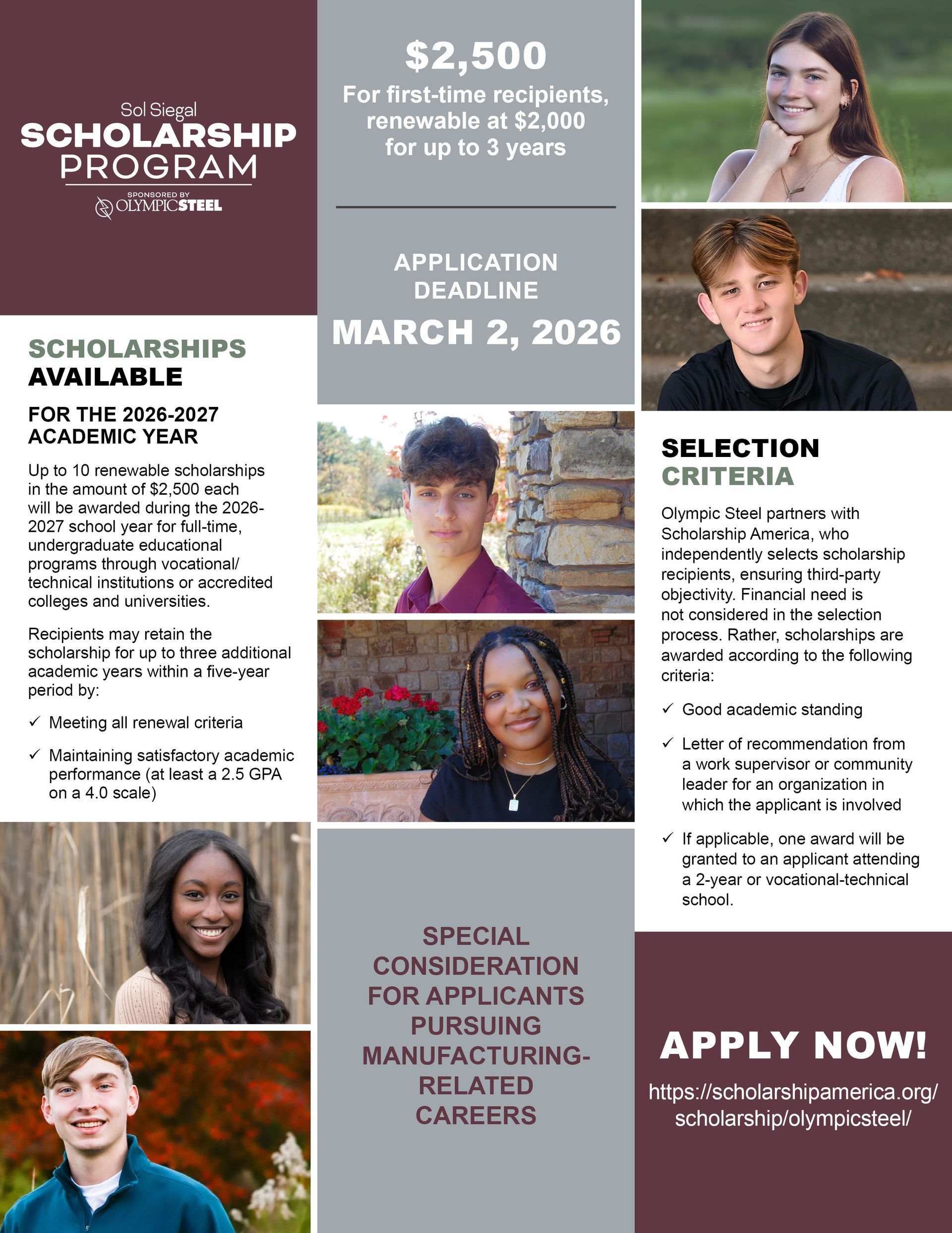 The Sol Siegal Scholarship Program honors the legacy of our founder by supporting educational efforts for the children of Olympic Steel’s employees. Each academic year, we offer up to 10 renewable scholarships in the amount of $2,500 to qualified students, as well as award $2,000 scholarships to previous recipients who meet the renewal criteria.
